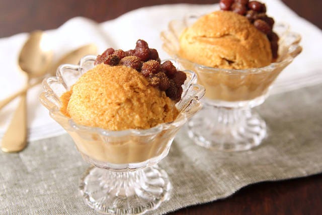 ⑥ 器に盛り付け、あずきをトッピングしてほうじ茶パウダーをふりかける。