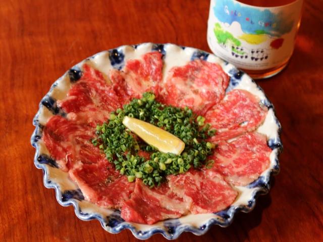 活け〆を漬けにして熟成させたお刺身や、和に洋を取り入れた「赤城和牛レア焼きカルパッチョ」(写真上)といった絶品のおつまみと、こだわりの日本酒、それに約50種の希少な日本ワインが自慢だ。