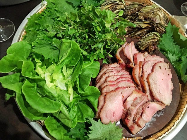 あふれるほどの葉野菜とレモングラスでグリルしたポーク「森の野菜ロール」(写真上)、土鍋に入れたココナッツミルクで茹でたツブ貝、それにラオスから空輸したナマズ料理など、見たこともないアジア料理に感激必至!