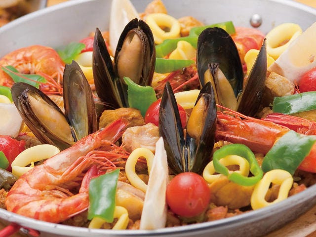 「北海道シーフードパエリア」(写真上)は、イカ、エビ、ムール貝など北海道産の魚介類がたっぷり。魚介のだしが染み込んだサフランライスと合わさり、さらにうまみを増す。お客の目の前でダイナミックに作られるので、ライブ感も楽しめるだろう。