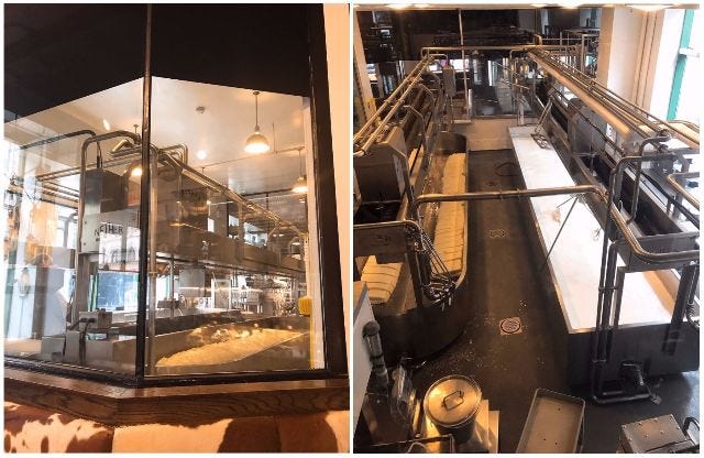 1階中央にはガラス張りの生産施設があり、その巨大なバスタブのような桶でつくっているのが「チーズカード」だ。2階からも施設を見下ろすことができる。
