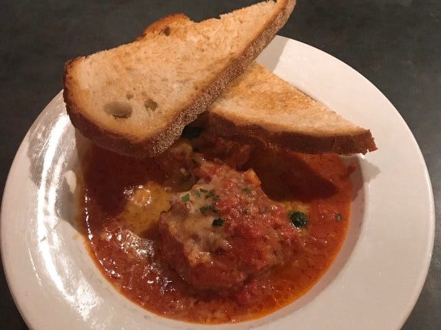 「マック&チーズ」の次に人気があるのは「ミートボール」(写真上)。大きくて柔らかいミートボールが2つ出てきて、ワインのお供にちょうどいい。