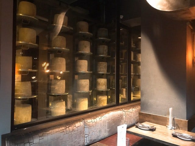レストランの一角には、約1年の間に熟成によってチーズがどう変わるかを示すディスプレイがある。バターでコーティングしてチーズクロスで包んだ大きなチーズの塊を、1カ月半ごとに置き換えている。