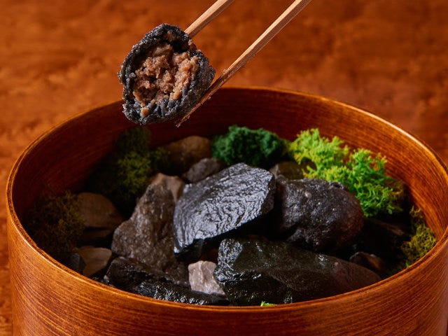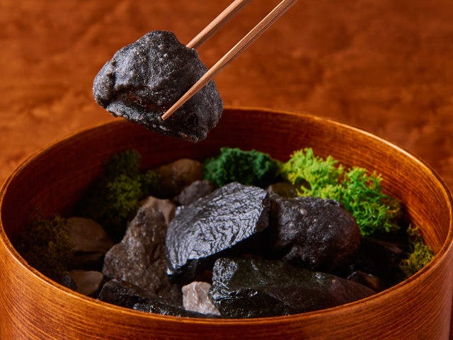実はこの石ころの中に2つだけ、竹炭の衣を使ったメンチカツが潜んでいる。実物を目の前にしても、相当目を凝らさないと見分けがつかないほど。ぜひ視覚と嗅覚をフル活用して探し出してみて。