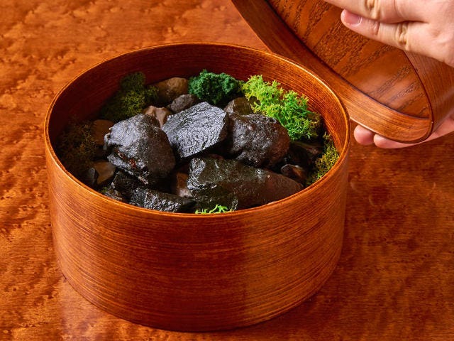 まずはアミューズより「The garden」(写真上)と名の付いた一品。筒状の木箱のフタをあけると苔と石ころがゴロゴロと転がっており、まるで庭園のようなビジュアル。