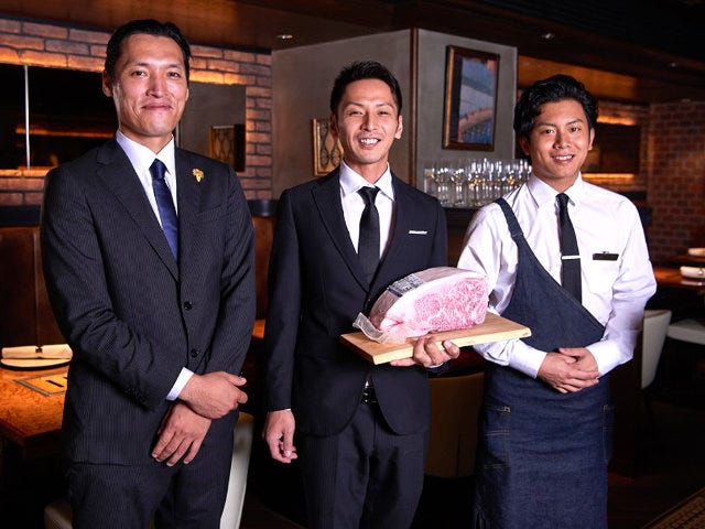 写真右から、レストランスタッフの糸数 泰さんとバーマネージャーの田中洋輔さん、レストランマネージャー兼ソムリエの川手鉄平さん。川手さんは、「当店でみなさまに楽しんでいただきたいのは、ストーリーのある食事体験です。キープしていただいたお肉を満喫した後、バーカウンターで食後酒を楽しんでいただく。あるいは、創意工夫に溢れたフュージョン料理で驚きと感動を体験していただく。そんな新しい焼肉の楽しみ方をご提案できればと思っています」と語ってくれた。