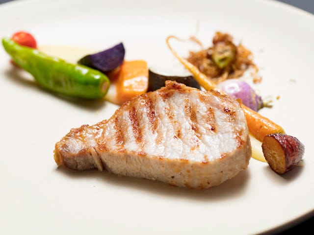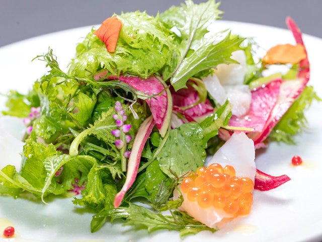 ある休日のメニューに登場したのは「カレイのカルパッチョのサラダ仕立て」と「豚のグリル」(写真上)。どちらも『北山農園』の野菜がたっぷりと添えられており、食べるごとに野菜のおいしさを実感できる。