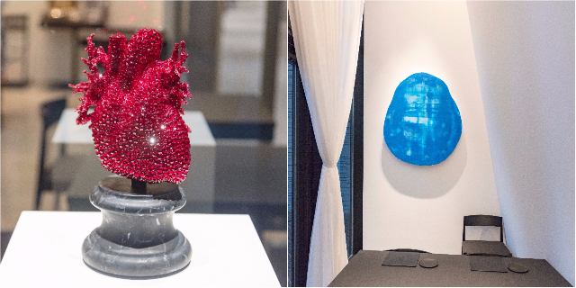 舘鼻氏が建築空間のクリエイティブディレクターを務めるのは今回が初めて。店内には、舘鼻氏の作家としての主題である「生と死」を扱う作品を展示している。自らの心臓を表し、真っ赤なクリスタルで装飾がなされた彫刻「Traces of a Continuing History: Heart, 2017」(写真左)や、脳を表現した「青の絵画」(写真右)などの作品を間近で見ることができるのも同店の楽しみ方のひとつ。