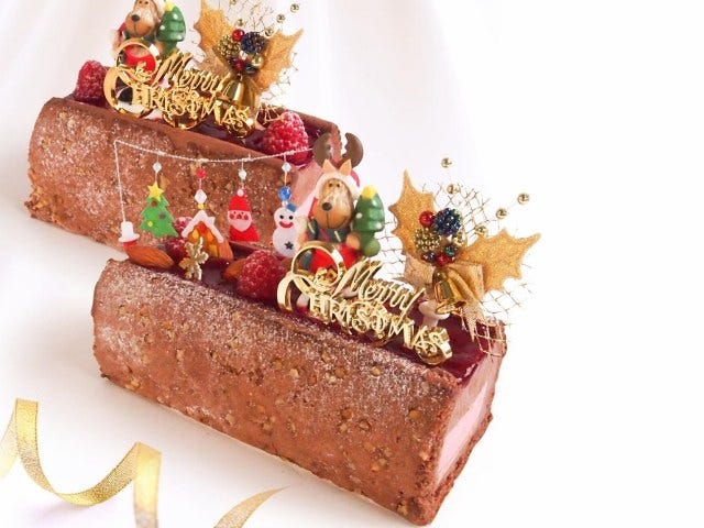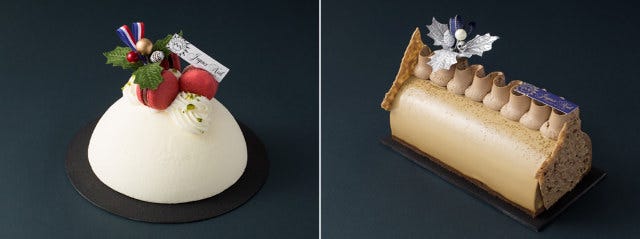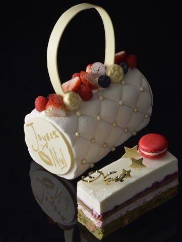 エレガントなバッグがモチーフの「プチマトラッセ ノエル 2017」(写真上)は、バッグ型チョコレートの中にフロマージュ、ピスタチオ、ローズ、フランボワーズ、フリュイルージュの層が美しい、リッチなケーキが隠れている。見ているだけでうっとりしてしまう高級感あふれるケーキたちは、クリスマスディナーに一層の華やかさをプラスしてくれる。