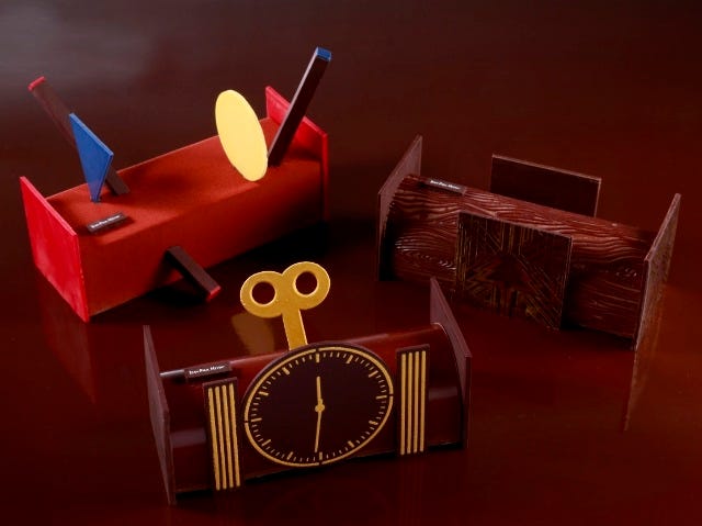 創造性にあふれるすばらしい宝飾時計が生み出された1930年代を表現したのが「ビュッシュ オクロック」(写真上)。ベルガモット風味のビスキュイ、アーモンドのビスキュイとフランボワーズのジュレ、ヘーゼルナッツのダコワーズとユズのシブーストをマダガスカル産カカオのムースで包む、さわやかな味わい。時計の針が12時ではなく12時30分を指しているのは、『ジャン=ポール・エヴァン』の30周年にちなんでいる。