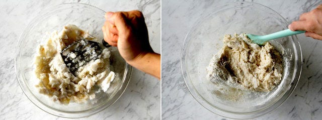 ② ボウルに移し、熱いうちに潰す。塩を加え、少しずつ量を調整しながら、数回に分けて小麦粉を加えていき、耳たぶぐらいの柔らかさになるまでこねる。