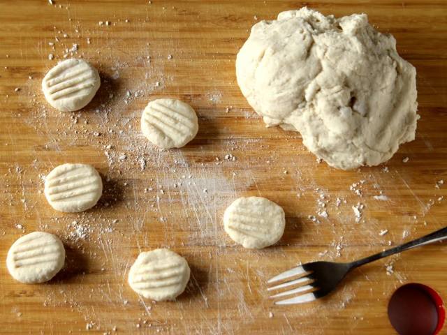 ③ 台に打ち粉(分量外)をし、手で丸めてフォークで押し成形してゆく。