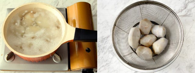 ① 里芋は皮を剥き、茹でる。竹串が通るくらいに柔らかく茹でたら取り出してザルにあげて水気をきる。