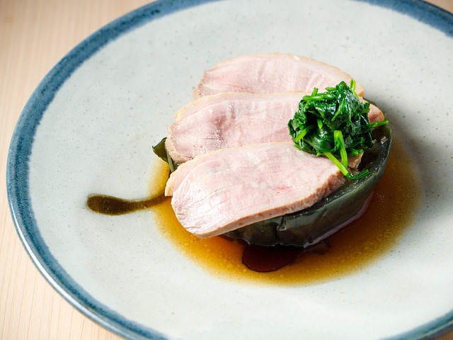 昭和に活躍した人間国宝、濱田庄司作の茄子を絵付けした益子焼に「鴨茄子」を盛り付けるなど、日本酒がすすむ絶品な料理は、器とのマッチングも大切に考えられている。(写真上)