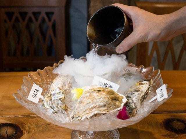 ドライアイスから湧き出る煙で冷やすことで生牡蠣のうまみをより引き出してくれる。インスタ映えも文句なし。