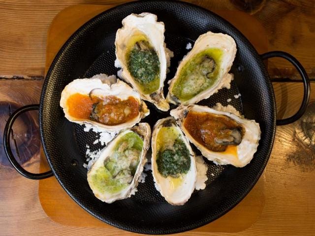 焼き牡蠣も同じように生食用の牡蠣を使用。人気の「焼き牡蠣3種セット」(写真上 ※2人前)はジェノベーゼ、ガーリックバター、スパイシーバターの3種類を食べ比べできる。