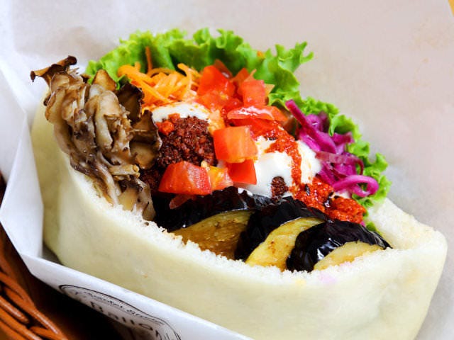 ヒヨコ豆を使用した中東生まれのスパイシーなコロッケ「ファラフェル」を、味付けや食感の違う7種の野菜で挟んだ「ファラフェルサンド」(写真上)は、まるで花束のような華やかさと溢れんばかりのボリュームが見事で、100%植物性なのに食べごたえもバッチリ!男子も大満足間違いなしだ。