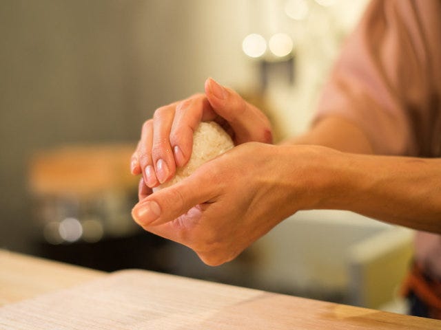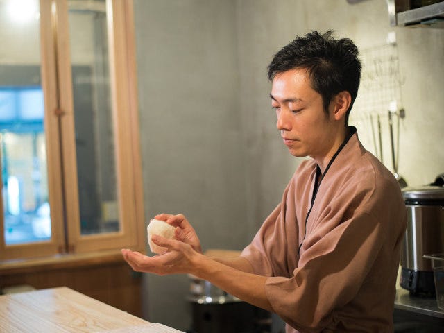 おむすびの米はもちろん秋田産。武田さんが秋田で結成した、若手米農家集団トラ男(トラクターに乗る男前たち)が作った米を使い、オーダーを受けてから目の前で作ってくれる。しっかり握る「おにぎり」とは違い、同店ではふんわりとした「おむすび」だ。