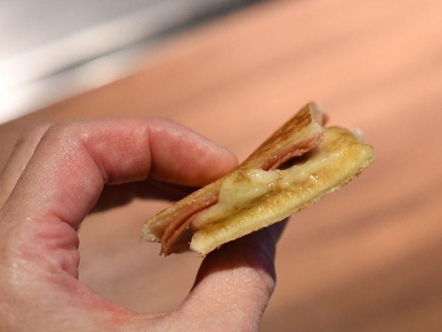 アミューズの「クロックムッシュ」(写真上)はオープン以来提供し続けている定番メニュー。アミューズと言えばカクテルグラスに入ったムースや、グジェール(チーズ風味のシュー皮)などが主流だ。果たしてそれらの料理が「アミューズ(心踊る・楽しませるの意)」の名にふさわしい料理なのか自問自答するうち、オープン2日前に「クロックムッシュ」が“降りてきた”という。鉄板で焼いたパンに、世界でも指折りのフランス・バイヨンヌ産の生ハム、グリュイエールチーズを挟む。