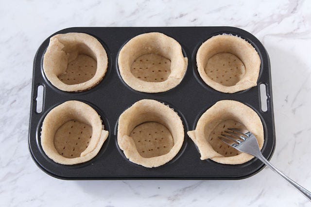 ⑤ ④の生地を冷蔵庫から取り出し、底の部分にフォークで数カ所に穴をあけ、200℃に予熱したオーブンで20分下焼きをする。