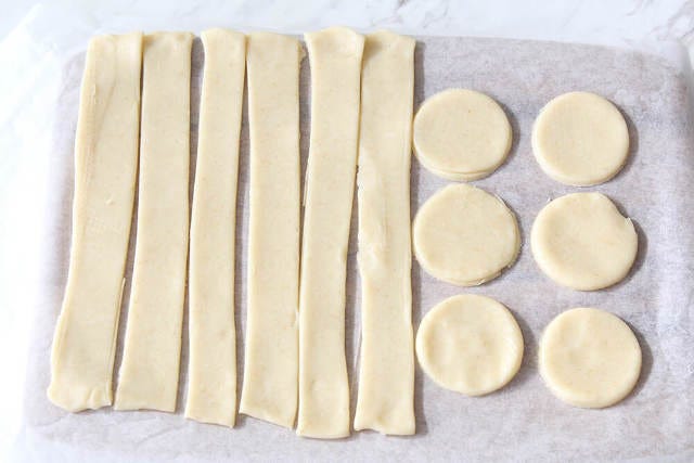 ④ マフィン型に合わせた円(直径6cm)と長方形(3cm×20cm)を6セット作る。マフィン型に合わせてグラシン紙またはオーブンペーパーを敷く。その上からカットした生地を敷いてラップをし、冷蔵庫に入れて1時間以上休ませる。(ここでよく冷やすことで焼きあげる時生地の膨らみを防ぐことができる。)