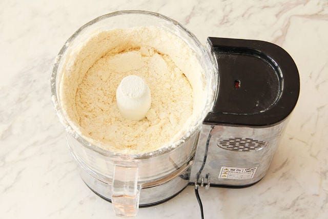 ① フードプロセッサーに水以外のキッシュ生地材料を入れ、サラサラの状態(粉チーズのような)になるまで攪拌する。