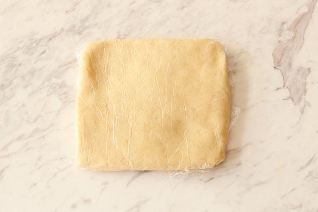 ② ①に水を加え生地がひとまとまりになるまでさらに撹拌し、写真(下)のような平たい四角形に成形してラップに包み、冷蔵庫で2時間以上休ませる。(※まとまりが悪い場合は冷水を適量足し、耳たぶくらいの固さになるまで調整する)