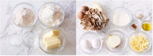風味よく仕上げるため、しめじ、えのき、舞茸、マッシュルームの4種のキノコを贅沢に使用。そこにじっくりと炒めて甘みを引き出したタマネギを加えれば、うまみたっぷりの味わい深いキッシュの出来上がり。