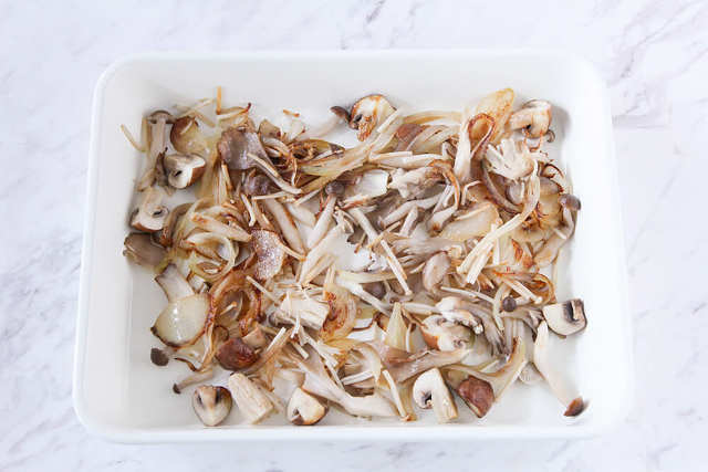 ⑦ フライパンにオリーブオイルとタマネギを入れて中火で熱し、透き通るまでじっくり炒める。しめじ、舞茸、えのき、マッシュルームを加えて水気が飛ぶまでさらに炒め、塩コショウで味を調えたら、粗熱がとれるまで冷ます。
