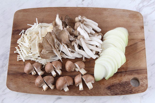 ⑥ 生地を焼いている間に野菜類を切る。タマネギは薄切りにする。キノコ類はすべて石づきを切り落とし、しめじと舞茸はほぐし、えのきは3等分、マッシュルームは4等分に切る。