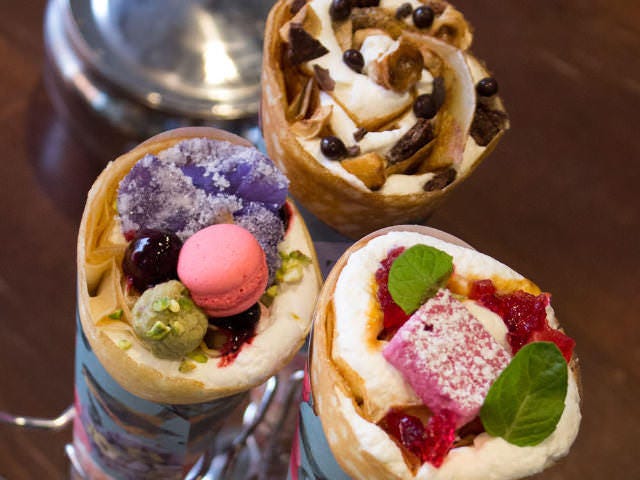 食べ歩きの定番といえばクレープ。最近は花やマカロンを花束のように巻き込んだもの、旬のフルーツがどっさり盛りつけられたもの、バターをたっぷり塗りこんで贅沢に仕上げたものなど、お店のこだわりがつまった魅力的な店が増えている。