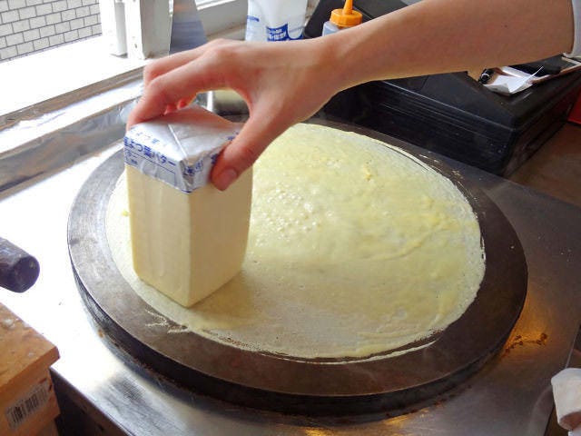 トッピングなどをせず、焼きっぱなしのままで買っていく常連さんもいるというこだわりの生地に、塊のバターを惜しげなく塗り込んだクレープをひと口ほおばれば、芳ばしい香りが口いっぱいに広がる。
