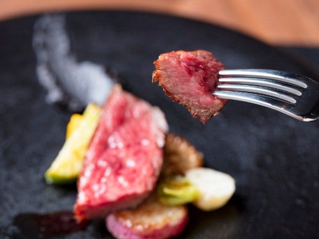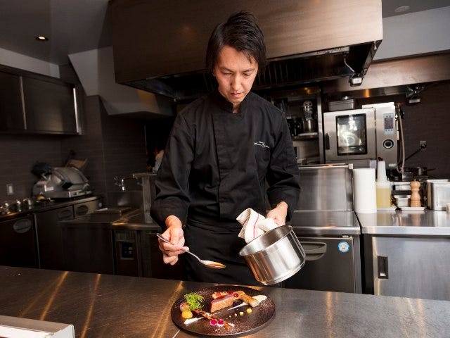 鴨も牛もひと口だけであまりのおいしさに全身が震えたほど。山下シェフの火入れは見事である。その秘訣を訊いてみた。「肉はできる限りゆっくり火を入れます。焼く前にどれだけ常温に戻せるかが決め手で、ほぼ人肌くらいの温度までもっていってから周りは香ばしく、中はほぼレアで焼き上げます。使うのはフライパン。ポイントはたっぷりのバターを使ってジューシーに仕上げることです」と答えてくれた。これこそが美食家たちを唸らせる山下シェフのテクニックなのである。
