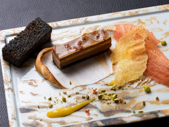 3つのアミューズの後の前菜には「鹿のムース」(写真上)。まるでケーキのようなこの皿は金木犀のジュレ、鹿もも肉とスパイス、オレンジ、フォン・ド・ヴォーなどを入れたムース、味噌で漬け込んだフォワグラ、パン・デピス(スパイスがたっぷり入ったパンという意味の菓子)が層になっている。落ち葉を踏みしめながら歩く鹿をイメージした。