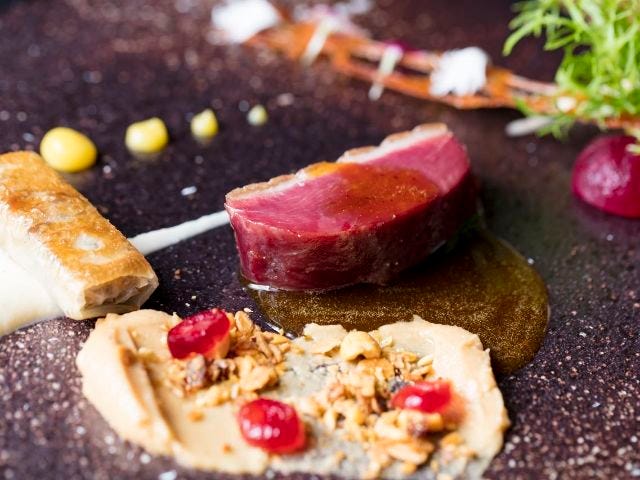 肉料理の得意な山下シェフならではのメニューが「Wミート」だ。魚料理の後に2種類の肉料理が出される。この日、用意されたのは鴨と牛。