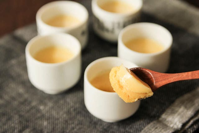 最後に紹介するのは、おちょこを器にした日本酒レアチーズケーキ。おちょこの底部分には、日本酒をたっぷり染み込ませたカステラを敷いて2層仕上げに。