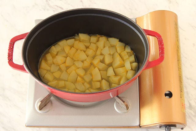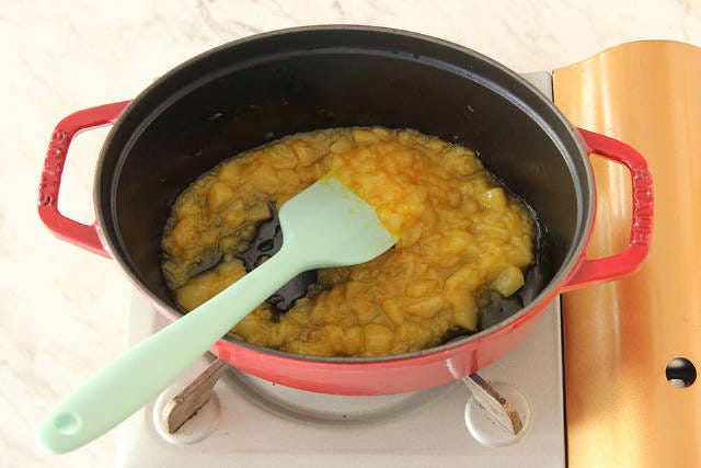 ③ 鍋を中火で熱し、リンゴが柔らかくなったらお好みの大きさにつぶし、とろみがつくまで30分煮たら完成。(※煮沸消毒した瓶で密閉保存し、一週間を目安に食べ切るようにする)