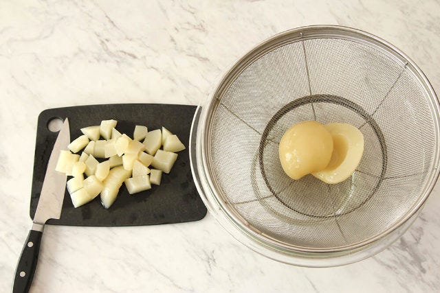 ② 桃の缶詰はザルにあげ、汁気を切りざく切りする。