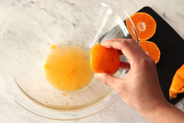 ① みかんは半分に切り、果汁を搾る。