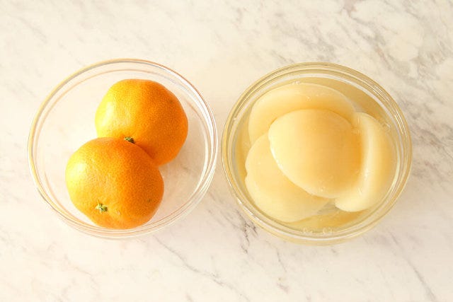 ① みかんの缶詰はザルに開け、汁気を切っておく。レモンは果汁を搾っておき、皮の部分は細切りにする。