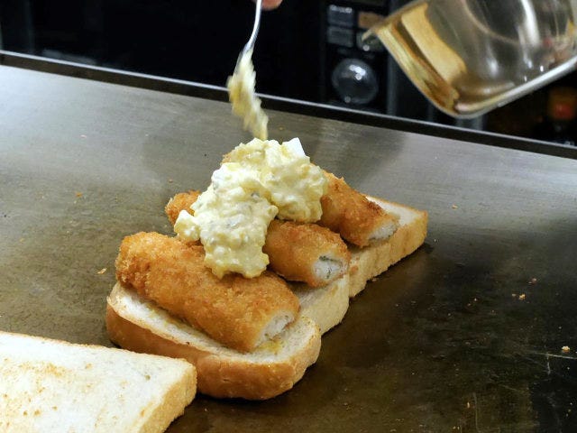 「フィッシュサンド」のこだわりひとつは自家製タルタルソースにある。ゴロゴロとしたゆで卵の具材感を味わえるクラッシュエッグを入れているのがポイント。フライとの相性が良いのは言うまでもない。女性客が9割だった同店に男性客も来てほしいという願いを込めて考案された新メニューだ。