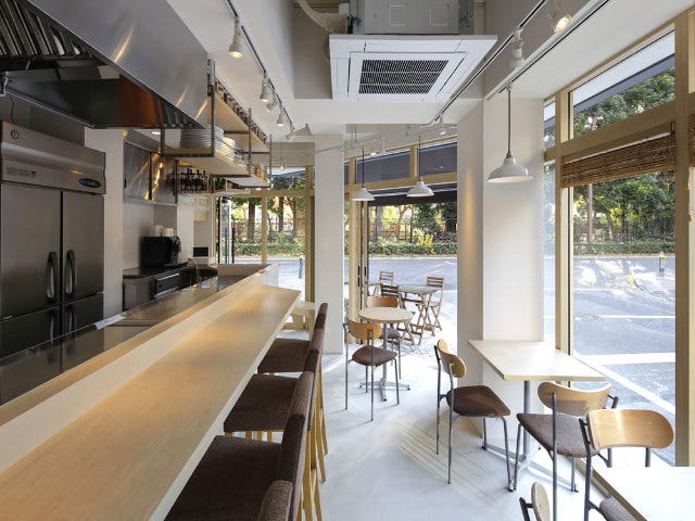 全面ガラス張りで店内に設置されているテーブル席は、新宿御苑が見えるように外に向かって配置されている。フォトジェニックなサンドイッチを作るシーンを見られるカウンター席ももちろんオススメだ。
