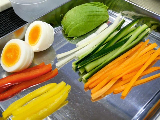 カットされた野菜を一つひとつ積み重ねていくのだが、その順番ははっきり決まっている。「野菜を挟む順番で味が違ってくるので、試作の時は野菜の順番を変えながら食感と味を確かめ、数え切れないくらいのサンドイッチを食べました」(前田さん)。