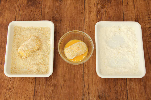 ⑨ 卵を溶きほぐし、⑧に小麦粉、溶き卵、パン粉を順につけたら、ふたたび溶き卵、パン粉を2度付けする。