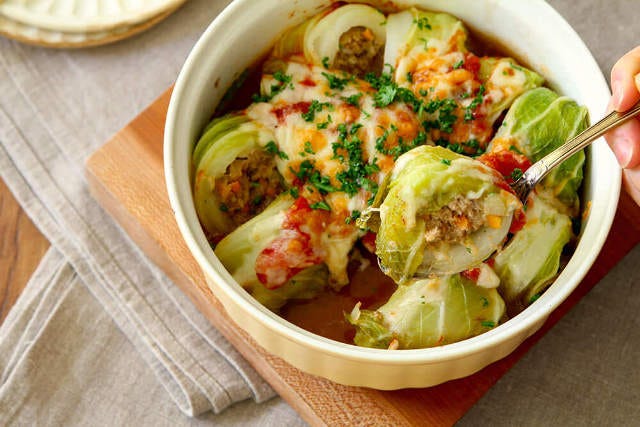 ■旬の白菜なら煮崩れ知らず! こんがりチーズが香ばしい「ロール白菜のトマト煮込みチーズ焼き」