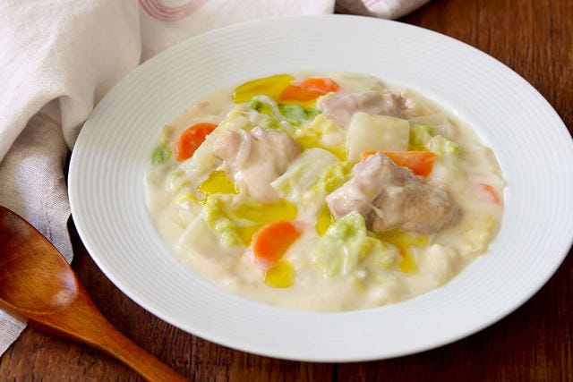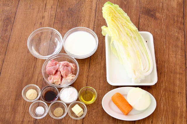 白菜から出る甘みと相性がよいのがクリーム煮。バターの香りを効かせたなめらかなクリームソースに、とろっと柔らかい食感の白菜を合わせると、思わず笑顔になってしまう優しいおいしさに。味にメリハリを付けるため、タマネギやニンジンなどの香味野菜、うまみのある鶏モモ肉を加えるのもポイント。