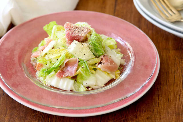 生ハムの塩気とオリーブオイルの香りをまとった生の白菜は、ひと口食べた瞬間に誰もが驚くおいしさ。
