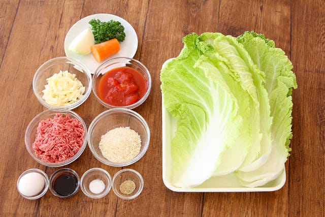 野菜で肉を巻く料理といえばロールキャベツが代表的だが、白菜で合挽き肉を巻いたのがこちらのアレンジ。