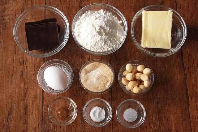 ① ブラックチョコレートは粗く割り、マカダミアナッツは半分に切る。