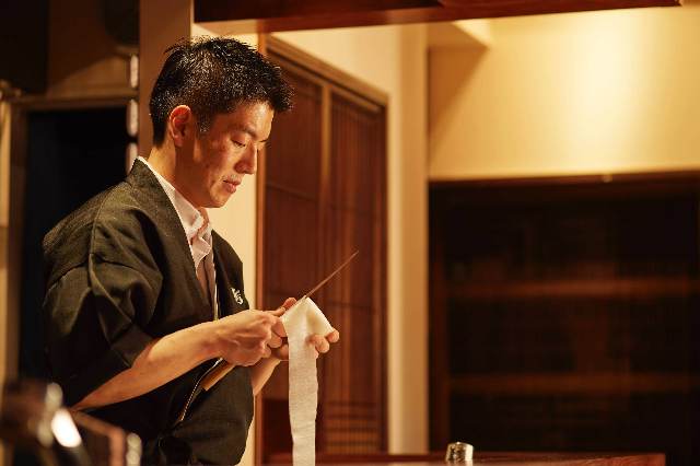 料理長の山本博之さん(写真上)は、京都の料亭『京料理 木乃婦(きのぶ)』、大阪の割烹『旬屋 じょう崎』での経験を経て、『麻布 秀』にて料理長の右腕として7年間腕を磨いた和食一筋の料理人だ。『だし秀 西麻布』では料理長に就任し、自慢のだしを活かした和と洋の要素を合わせた独自のハイカラ和食を提案する。